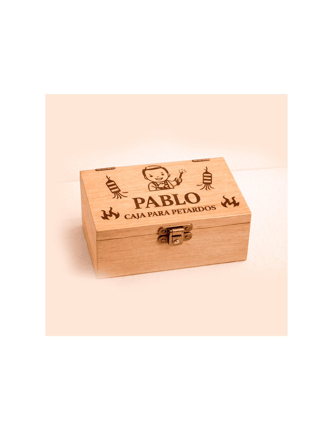 Caja de madera natural grabada con láser, diseñada para que los más pequeños guarden sus petardos de forma segura y organizada durante las Fallas.