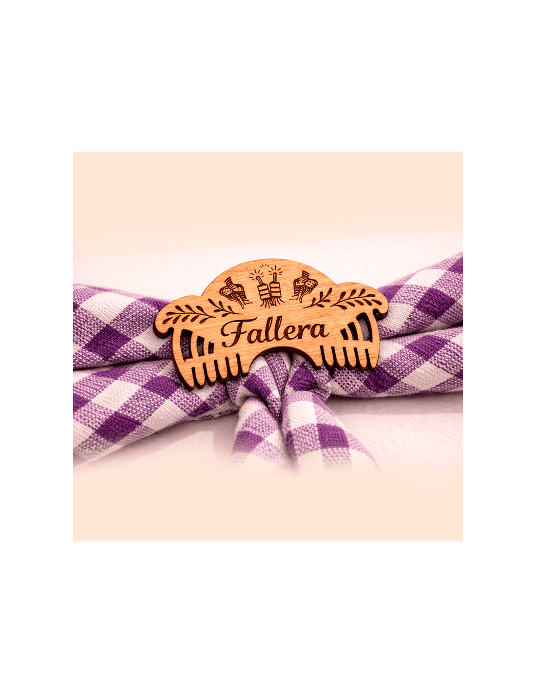 Sujeta pañuelo de madera natural grabado con láser, diseñado para sujetar el “mocador” fallero con un estilo tradicional inspirado en la peineta valenciana.