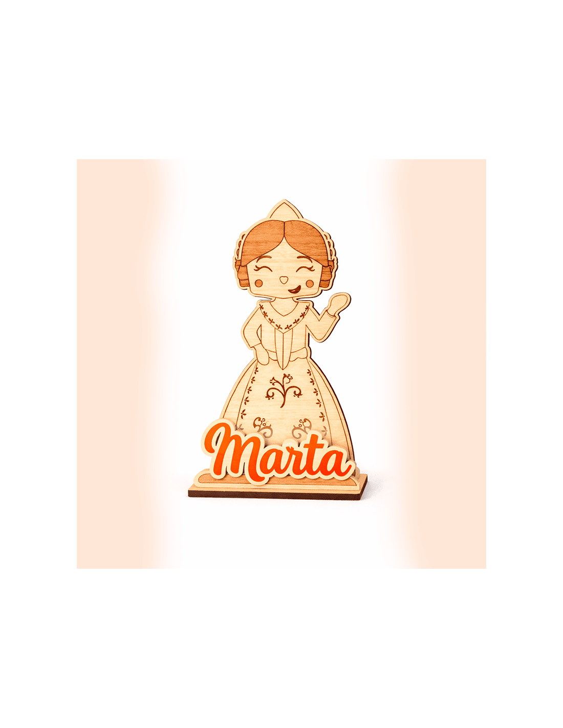 Figura decorativa de fallera fabricada en madera natural mediante corte y grabado láser, personalizada con el nombre en relieve 3D.