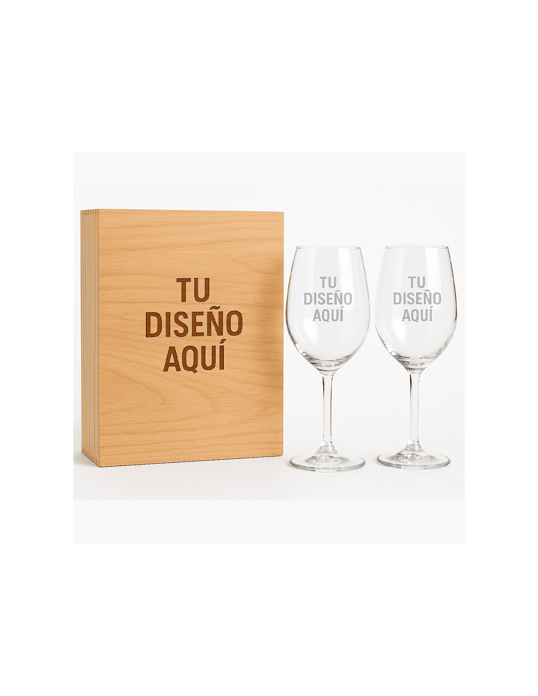 Cada copa puede personalizarse con nombres, fechas, iniciales o logotipos, mientras que la caja de madera se graba con tu diseño, mensaje o dedicatoria.